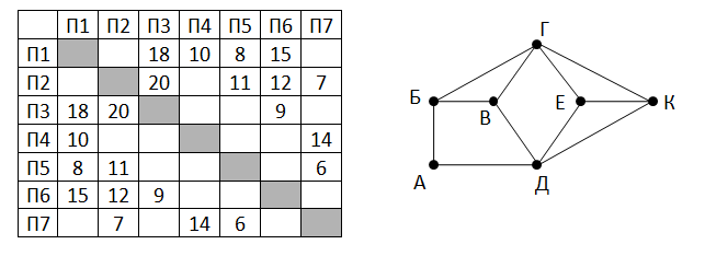 На рисунке справа схема дорог Н-ского района изображена в виде графа, в таблице содержатся сведения о длинах этих дорог (в километрах). Так как таблицу и схему рисовали независимо друг от друга, то нумерация населённых пунктов в таблице никак не связана с буквенными обозначениями на графе. Определите длину кратчайшего пути из пункта А в пункт В, если передвигаться можно только по указанным дорогам. В ответе запишите целое число – длину пути в километрах.