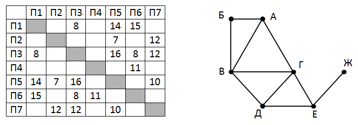 На рисунке схема дорог Н-ского района изображена в виде графа, в таблице содержатся сведения о длинах этих дорог (в километрах). Так как таблицу и схему рисовали независимо друг от друга, то нумерация населённых пунктов в таблице никак не связана с буквенными обозначениями на графе. Укажите кратчайший путь из пункта Б в пункт Ж. В ответе перечислите все населённые пункты, через которые проходит путь. Например, путь из Г в В через А и Б записывается как ГАБВ.