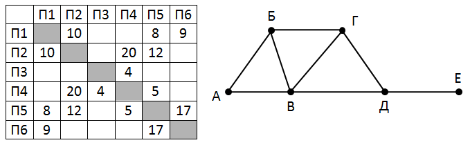 На рисунке справа схема дорог Н-ского района изображена в виде графа, в таблице содержатся сведения о длинах этих дорог (в километрах). Так как таблицу и схему рисовали независимо друг от друга, то нумерация населённых пунктов в таблице никак не связана с буквенными обозначениями на графе. Определите длину кратчайшего маршрута между пунктами Г и Д. Передвигаться можно только по указанным дорогам.