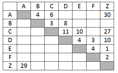Между населёнными пунктами A, B, C, D, E, F, Z построены дороги с односторонним движением. В таблице указана протяжённость каждой дороги. Отсутствие числа в таблице означает, что прямой дороги между пунктами нет. Например, из A в B есть дорога длиной 4 км, а из B в A дороги нет.