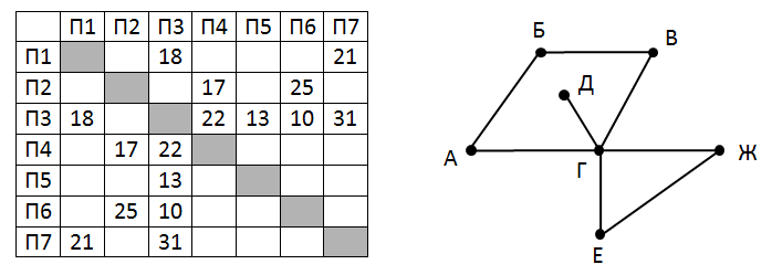 На рисунке справа схема дорог Н-ского района изображена в виде графа, в таблице содержатся сведения о длинах этих дорог (в километрах). Так как таблицу и схему рисовали независимо друг от друга, то нумерация населённых пунктов в таблице никак не связана с буквенными обозначениями на графе. Определите длину дороги между пунктами Е и Ж. Передвигаться можно только по указанным дорогам.