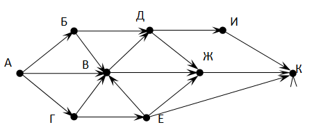 На рисунке – схема дорог, связывающих города А, Б, В, Г, Д, Е, Ж, И, К. По каждой дороге можно двигаться только в одном направлении, указанном стрелкой. Сколько существует различных путей из города А в город К?