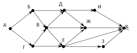 На рисунке – схема дорог, связывающих города А, Б, В, Г, Д, Е, Ж, И, К. По каждой дороге можно двигаться только в одном направлении, указанном стрелкой. Сколько существует различных путей из города А в город К?