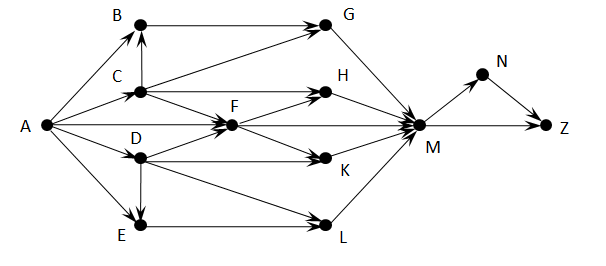 На рисунке – схема дорог, связывающих города A, B, C, D, E, F, G, H, K, L, M, N, Z. По каждой дороге можно двигаться только в одном направлении, указанном стрелкой. Сколько существует различных путей из города А в город Z?