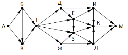 На рисунке изображена схема дорог, связывающих города А, Б, В, Г, Д, Е, Ж, З, И, К, Л, М. По каждой дороге можно двигаться только в одном направлении, указанном стрелкой. Сколько существует различных путей из города А в город М, не проходящих через город Е?