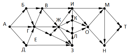 На рисунке – схема дорог, связывающих города А, Б, В, Г, Д, Е, Ж, З, И, К, Л, М, Н, O, Т. По каждой дороге можно двигаться только в одном направлении, указанном стрелкой. Сколько существует различных путей, ведущих из города А в город Т и проходящих через город К?