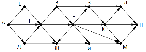 На рисунке – схема дорог, связывающих города А, Б, В, Г, Д, Е, Ж, З, И, К, Л, М, Н. По каждой дороге можно двигаться только в одном направлении, указанном стрелкой. Сколько существует различных путей, ведущих из города А в город Н и проходящих через пункт Г или через пункт К, но не через оба этих пункта?