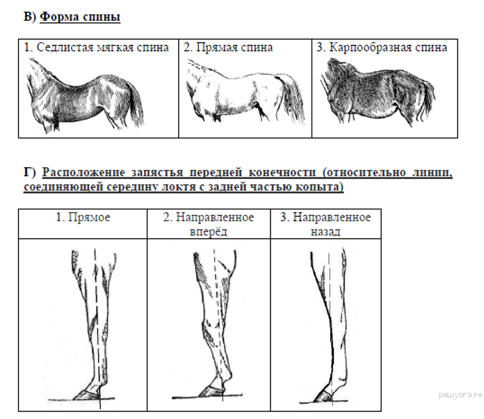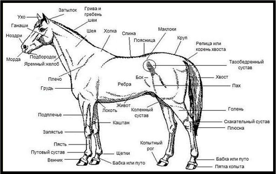 Лошадь – давно одомашненное животное. Поэтому многие части имеют специфические названия (в школьных курсах не изучаются). Поэтому перед экзаменом необходимо учащихся познакомить с частями лошади: переносица, седалищный и пяточный бугор, запястье передних конечностей, локоть, путовый сустав.